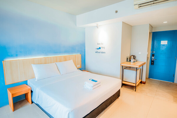 Bloo Bali Hotel in Legian offers family rooms with air-conditioning, private bathrooms, and modern amenities. Each room includes a work desk, TV, and free WiFi, ensuring a pleasant stay. Guests can enjoy a family-friendly restaurant serving Indonesian cuisine with halal options. The modern ambiance provides a relaxing environment for lunch and dinner. Breakfast options include continental, buffet, and Asian, featuring fresh fruits. The hotel features a year-round outdoor swimming pool, terrace, and balcony with pool and city views. Additional amenities include a bar, fitness center, and free on-site private parking. Located 3.1 mi from Ngurah Rai International Airport and 1.2 mi from Dewa Ruci Roundabout, the hotel is close to attractions such as Kuta Beach (1.4 mi) and Waterbom Bali (2.2 mi). Guests appreciate the convenient location and excellent service.