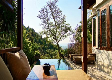 ONE BEDROOM POOL VILLA 155 -200 sqm butler serviced villas with lush gardens and seaview. Bedroom with vaulted hardwood ceilings and en-suite living room, decorated with rare antiques and rich fabrics in a distinctly personal style. Bathroom has bathtub and open-air shower. Outside a large veranda with a traditional bale-pavillion and a large, private swimming pool.